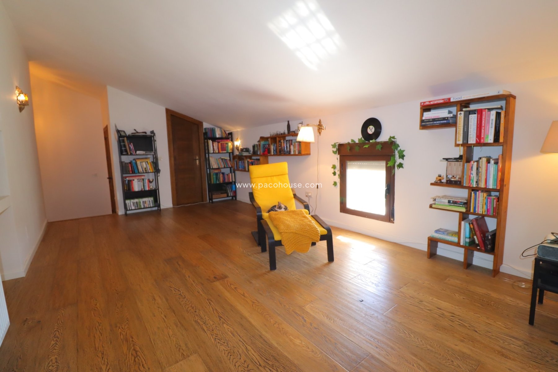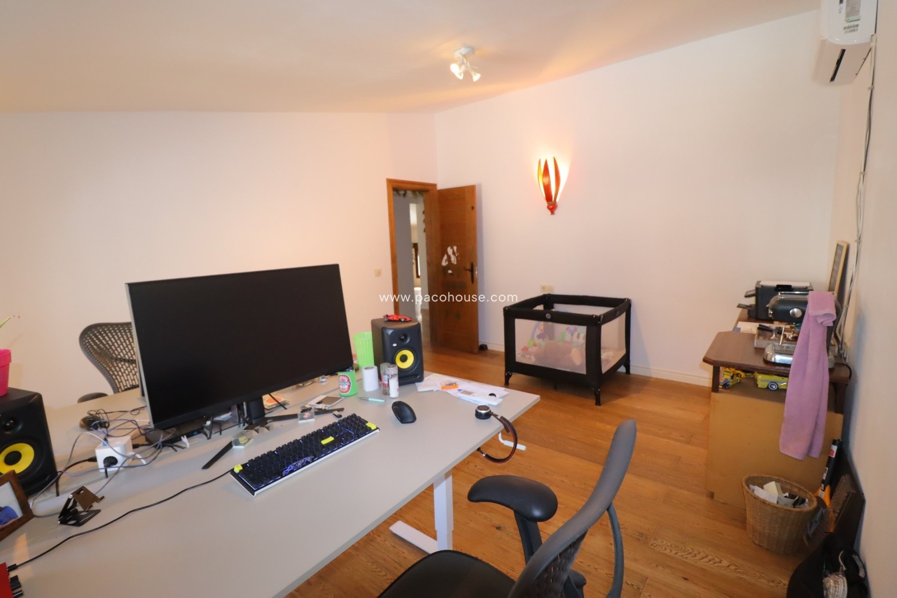 Upper level: To the right we find an airy living room providing access to 3 double bedrooms, one of them with an en-suite shower room. One of these bedrooms is currently used as an office with air-conditioning unit.