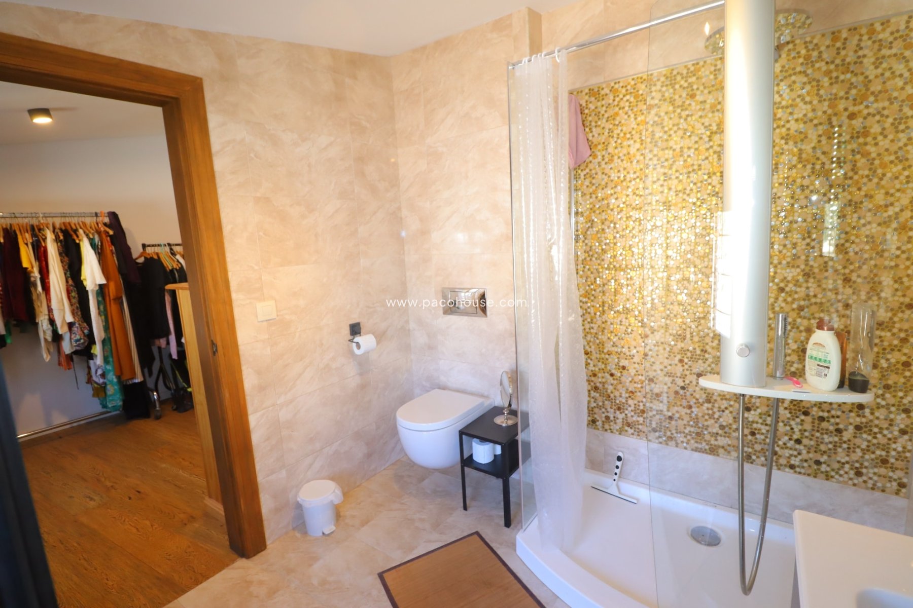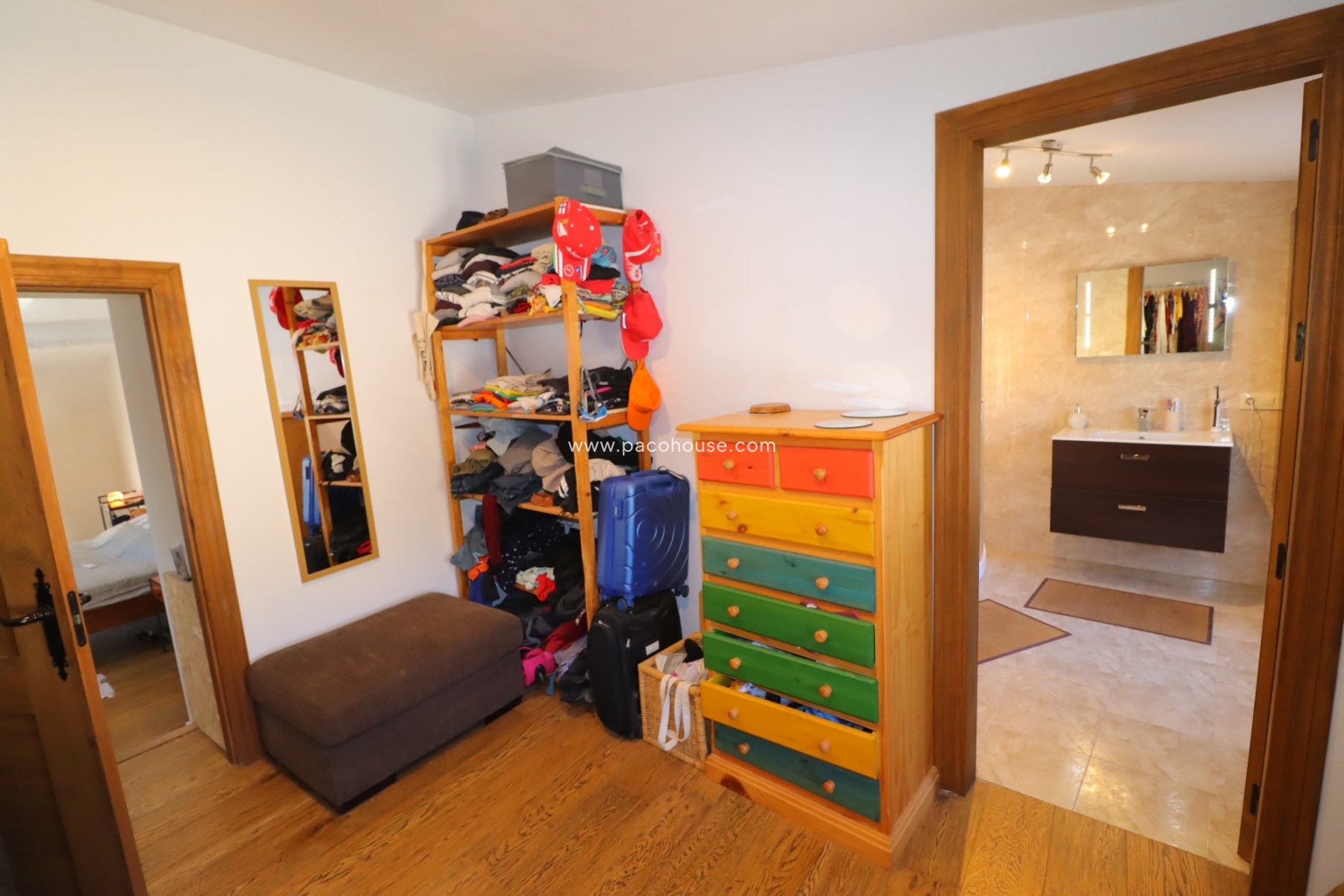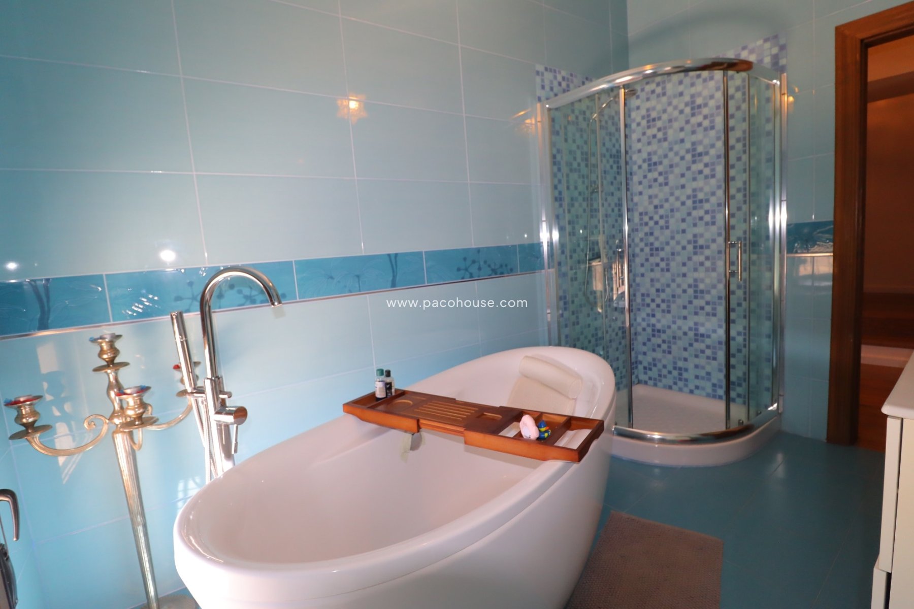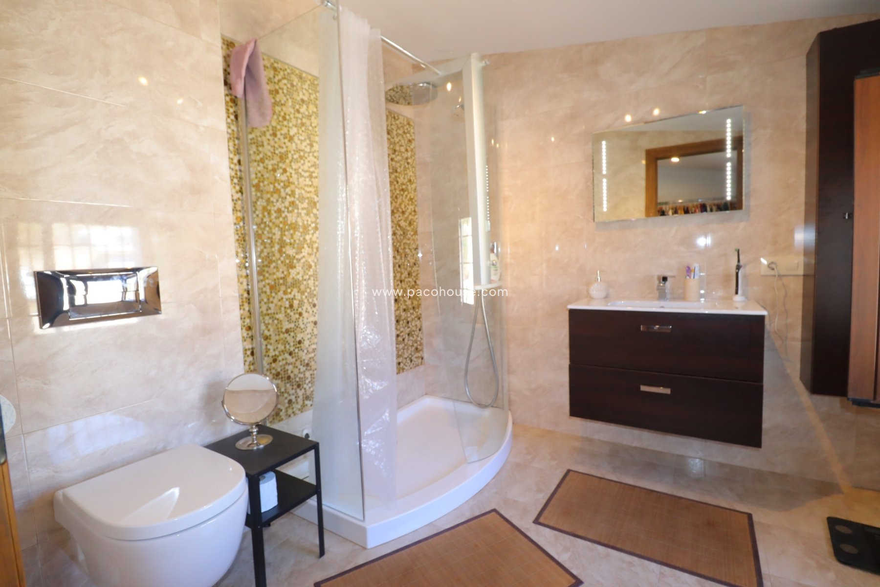 Returning to the landing there is a built in airing cupboard and a separate storage cupboard. To the front a short hallway leads to the right to a modern family bathroom with a corner shower and free standing bath, opposite is a further large double bedroom with air-conditioning unit. To the side with views to ‘La Muela’ we find the master bedroom, impressive in size with air-conditioning unit and separate dressing room leading to a modern and spacious shower room.