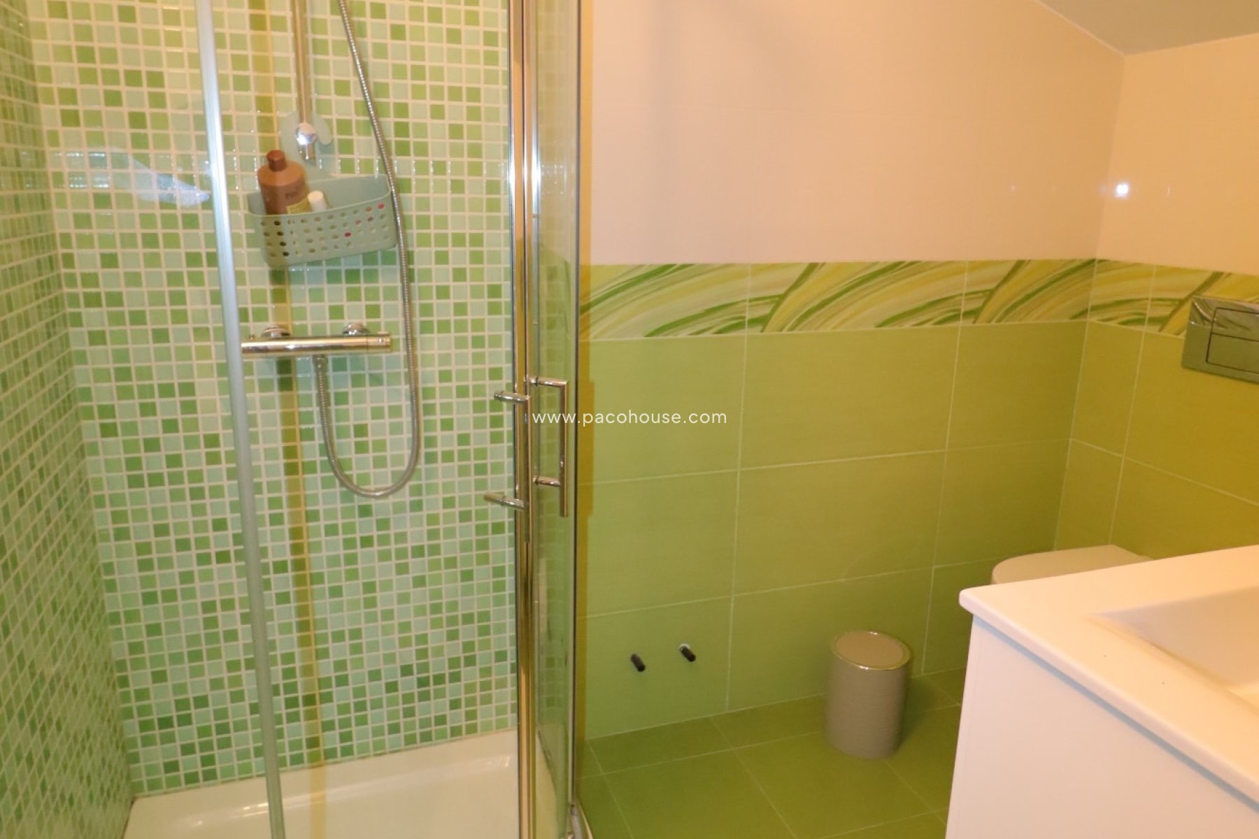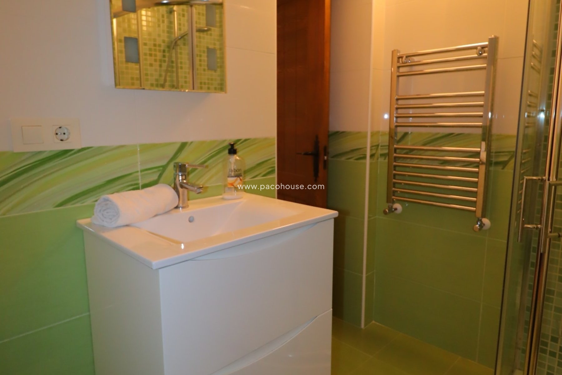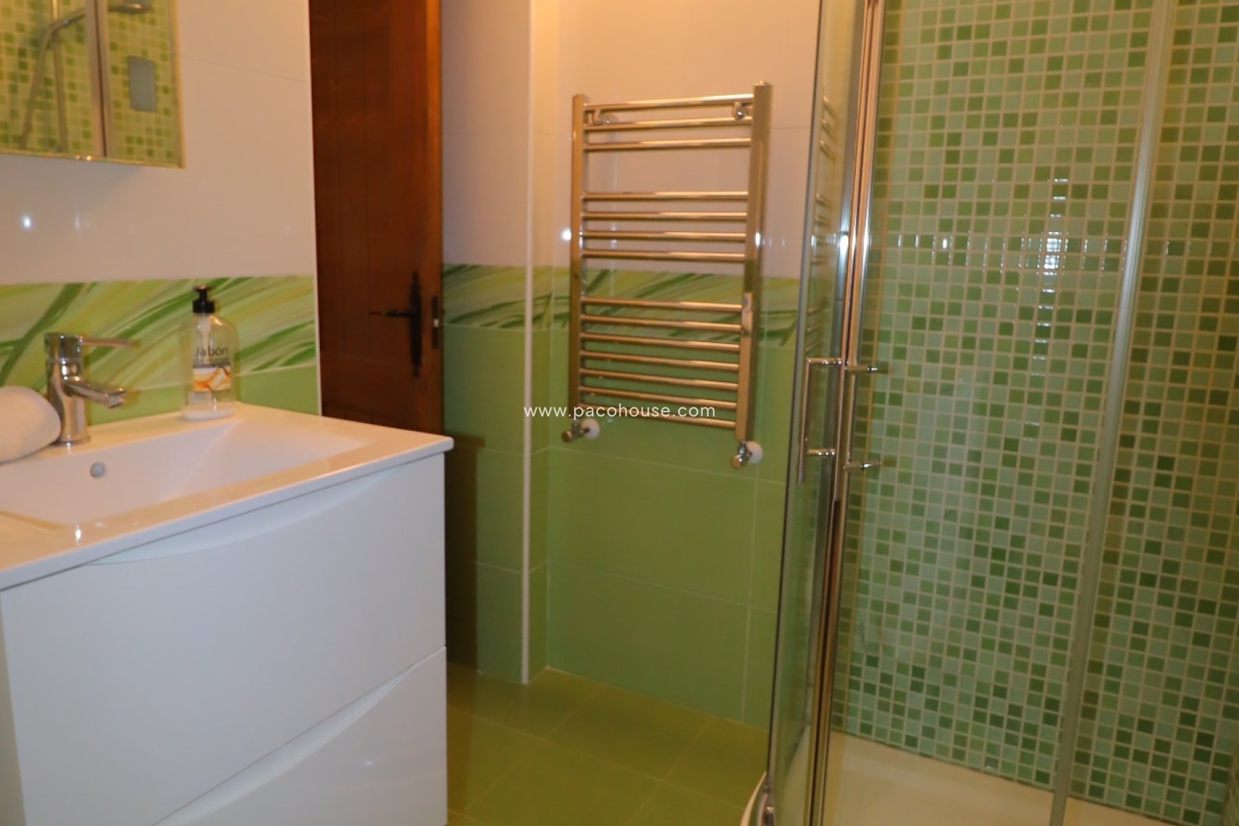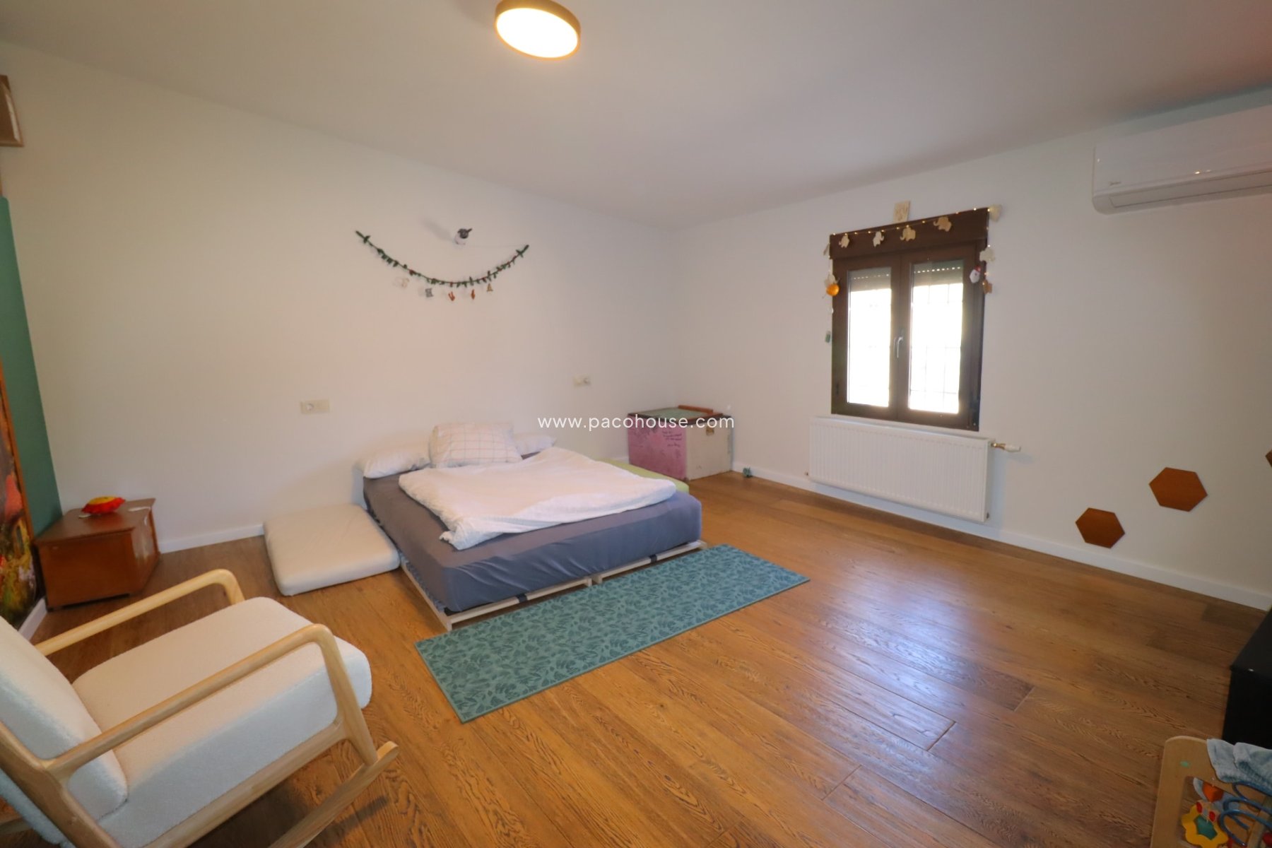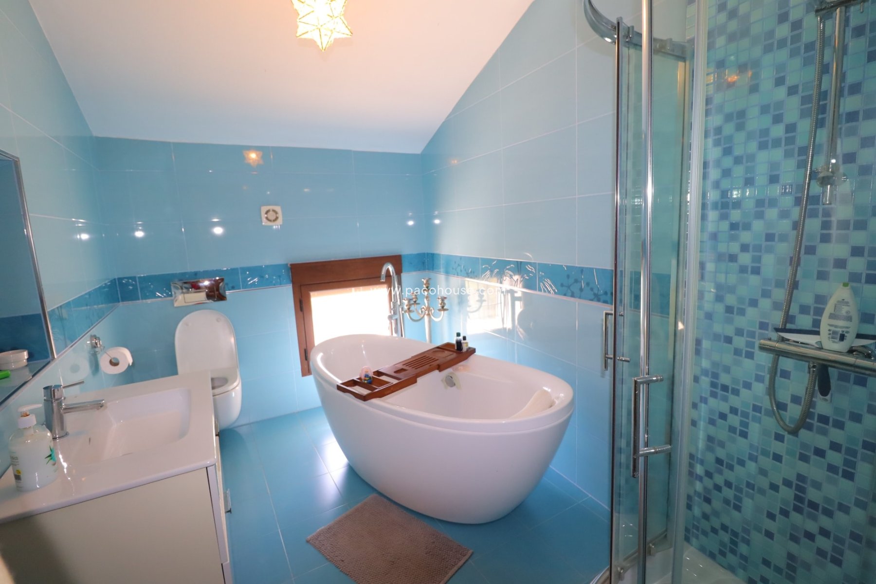 Returning to the landing there is a built in airing cupboard and a separate storage cupboard. To the front a short hallway leads to the right to a modern family bathroom with a corner shower and free standing bath, opposite is a further large double bedroom with air-conditioning unit. To the side with views to ‘La Muela’ we find the master bedroom, impressive in size with air-conditioning unit and separate dressing room leading to a modern and spacious shower room.