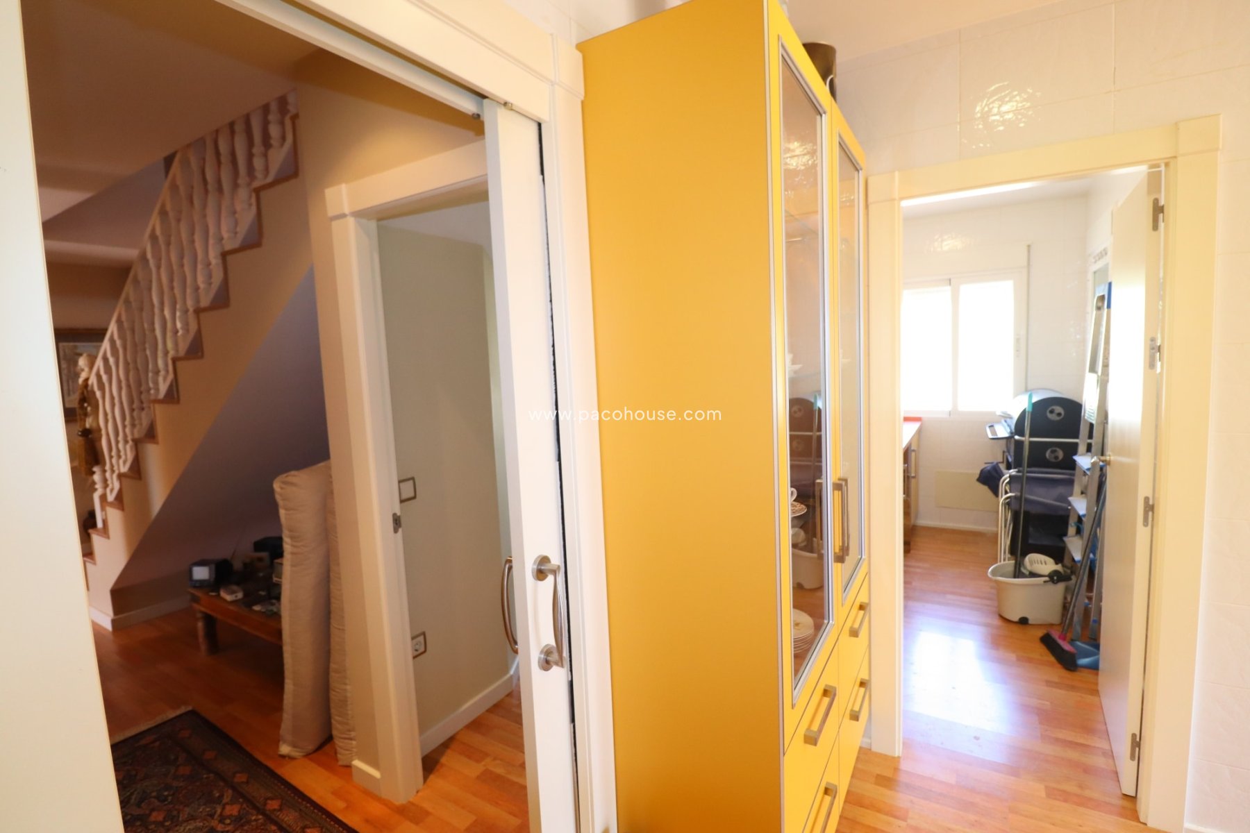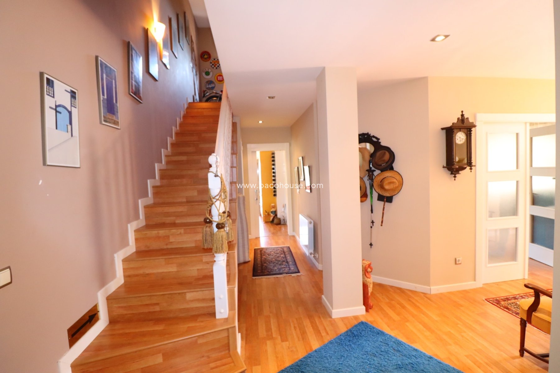 A staircase leads up to a large covered front. Front door to the house. This then opens in to a grand wide hallway. . This then opens in to a grand wide hallway. Double doors to the right lead into an extensive and bright lounge-living-dining room with a feature wood-burning and large patio doors with security shutters electrically operated opening onto an enchanting lower terrace to the side of the villa.There is also direct access to the kitchen from the living room.