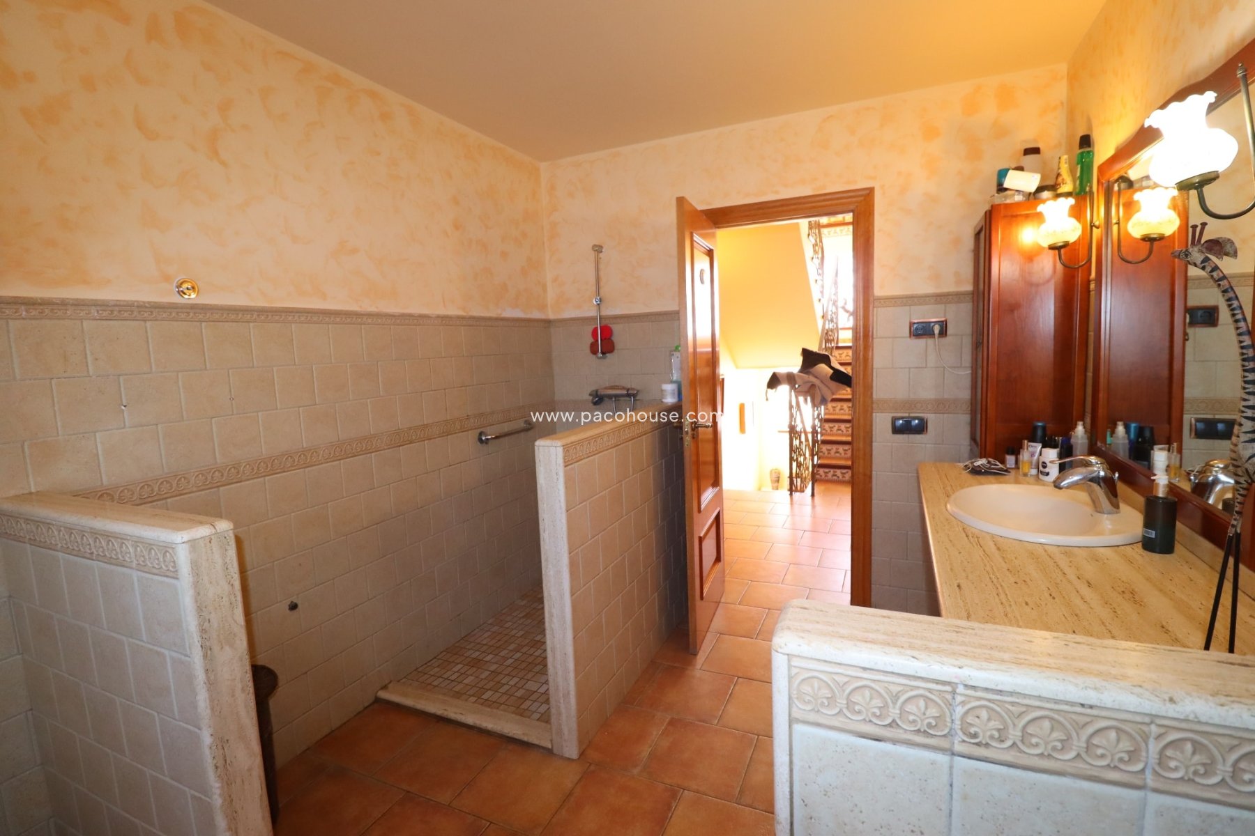 From the entrance-hall a beautiful and bright stairway leading up to the upper floor. As we reach the landing a door to the front opens onto a fantastic, huge master suite (bedroom 5) with slanted ceilings, fitted wardrobes, air-conditioning unit, en-suite bathroom and French windows out to a roof terrace with stunning views over the Lorca valley towards the mountains and the city of Lorca with its medieval castle at the top.