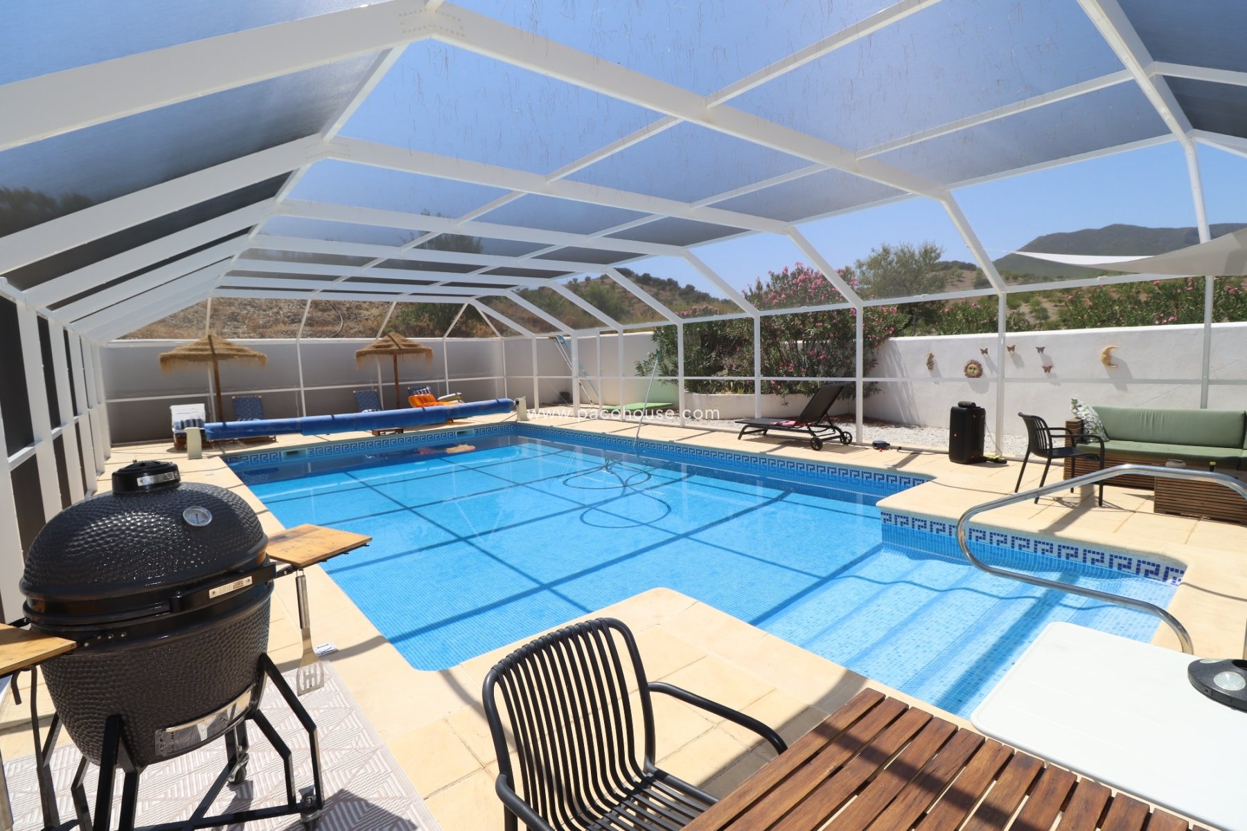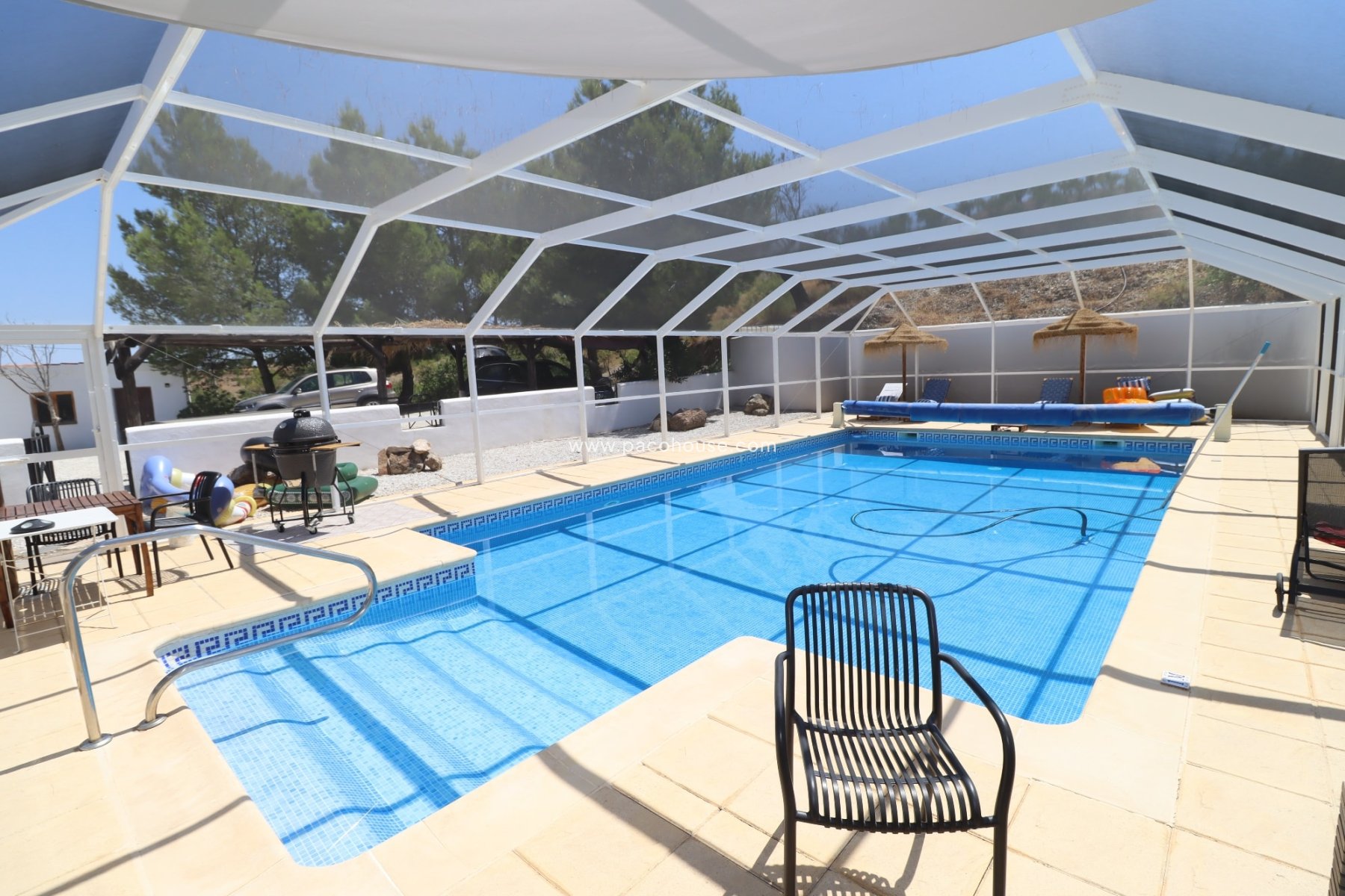 4 bedrooms 3 bathrooms (all en-suite) 1 toilet in total offering 2 fully self-contained apartments plus the owner’s accommodation. Each apartment with their own private terraces with patios and lovely built-in BBQ area, large swimming pool (10x6) with a large luxury Florida style, mansard roof design enclosure measuring 17 metres by 11 metres; further detached 2 storey outbuilding for storage/workshop next to the house, carport for several cars; surrounded by 3 hectares of productive land with mature almonds, olives and a few other fruit trees. Situated in the foothills of the Sierra de las Estancias, with superb views of the distant mountains and surrounding countryside, this rural retreat is an ideal family house for those seeking peace and tranquillity or for holiday letting. The market town of Velez Rubio, with plenty of amenities is less than 10 minute drive. The property is totally secluded.