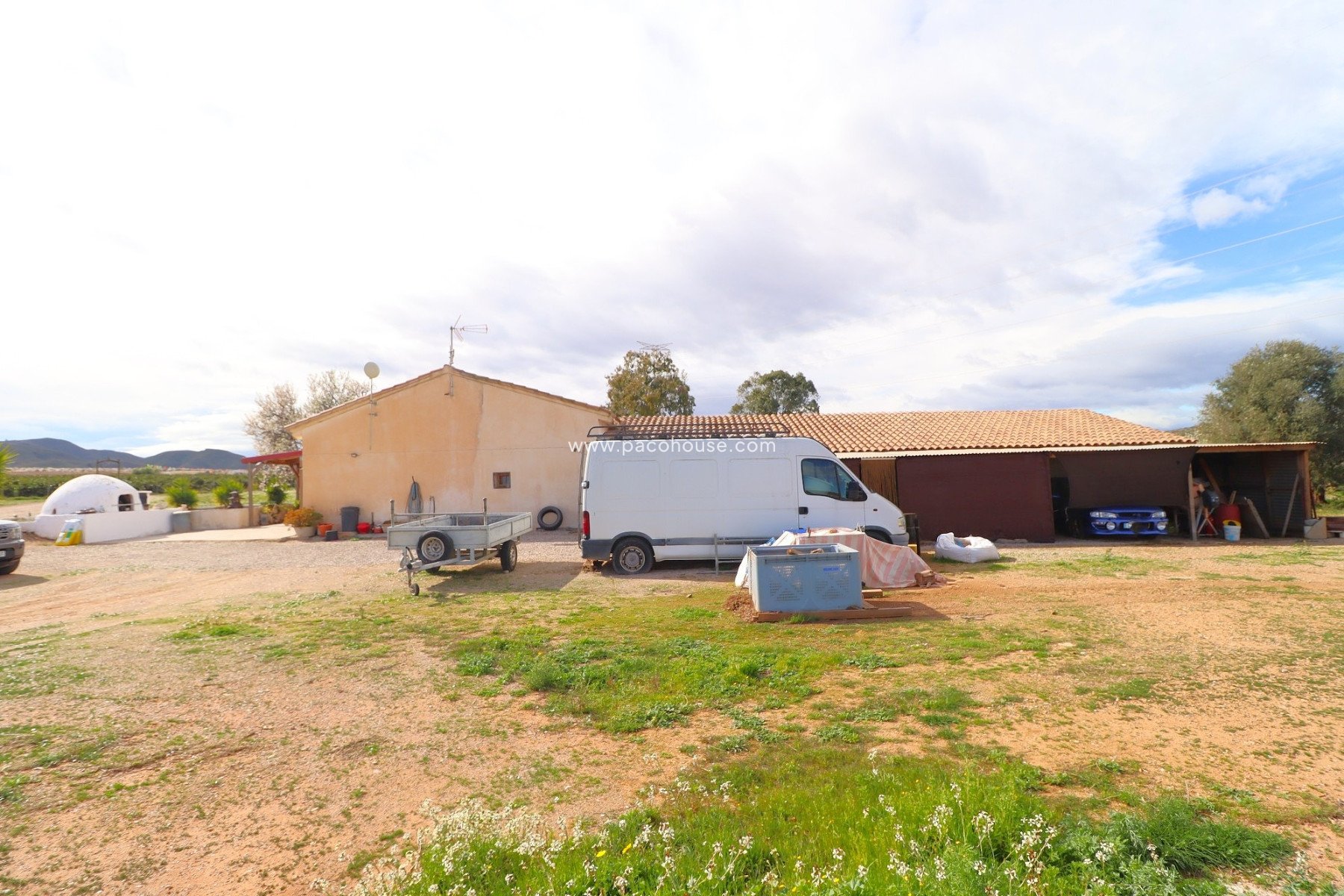 Detached 3 bed (two of them are en-suite) 3 bath country property with attached independent, large workshop (over 150 sqm) which could be converted into further accommodation, ; set in a fairly flat, fully fenced and gated plot of 20000 sq metres (two hectares) of fertile land, situated less than a 5 minute drive from the village of Aguaderas with a few amenities (2 bars, mini supermarket, health centre, chemist, garage & petrol station), less than 10 minutes’ drive from the sought-after village of Purias with plenty of amenities. The large and historical city of Lorca with its outdoor shopping centre is less than 15 minutes’ drive and the stunning beaches of Águilas are approximately 25 minutes’ drive. Situated on an elevated position it enjoys stunning views across the countryside, surrounding orchards, to the distant mountains.